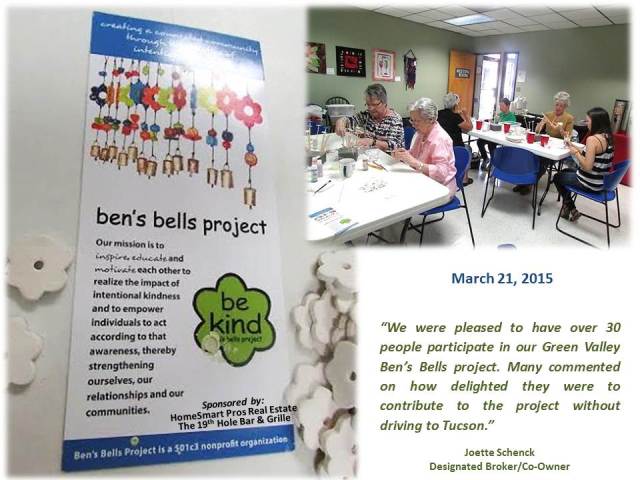 Several years ago, Jeannette Maré, founder of Ben’s Bells, spoke to our club and several of us went to the Ben’s Bells in Tucson where we painted ceramic pieces that went on to the Ben’s Bells wind chimes. Ben’s Bells, whose mission is to spread acts of kindness in communities, came to Green Valley! On Saturday, March 21 approximately 30 local residents (a few from TWOQC) joined forces at the Green Valley Village to sculpt and paint components of the bells.