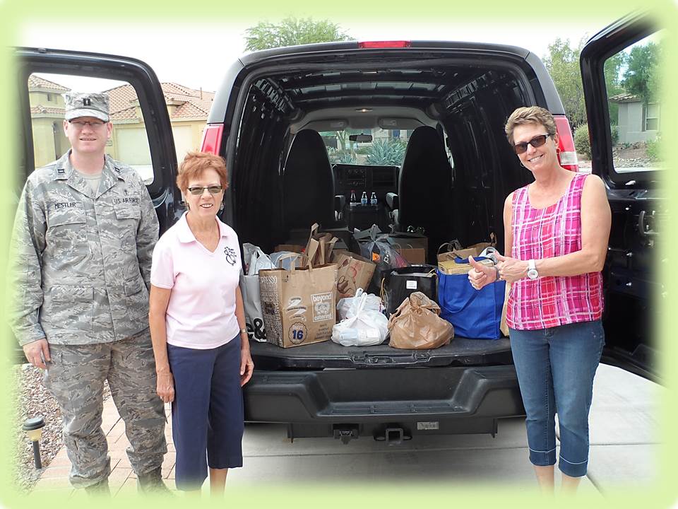 Captain (Chaplain) Nathan Mestler, Peggy McGee, and Barbara Gavre, Family Readiness Program Manager, are all smiles upon seeing the 400 lbs. of groceries the Quail Creek Community donated in the annual 4th of July Food for the Troops campaign. (Photo is by Steve Abel.)