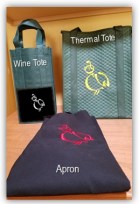 Contact Pat Neel (625-4476) for Aprons (tavern/craft size $15, standard size $18), thermal totes ($7 ea or 3 for $20), wine totes ($4 ea or 3 for $10) all with the cute TWOQC logo.