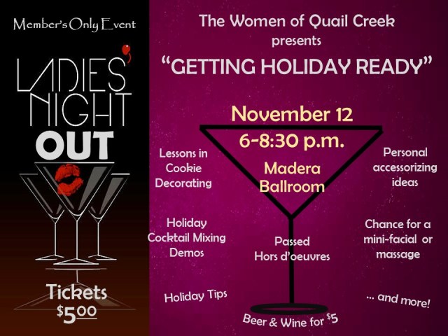 - Nov. 12 – 6-8:30 p.m.→“Getting Holiday Ready” Ladies Night Out