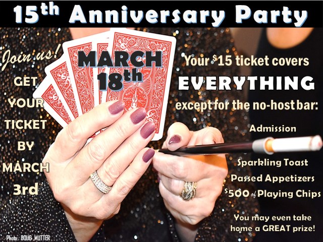 Members: If you haven’t purchased your $15 ticket to the Anniversary Casino Party, do so NOW or at least by March 3. You don’t want to miss the action. Imagine a glitzy party, sharing memories with friends and doing a bit of gambling for fun.