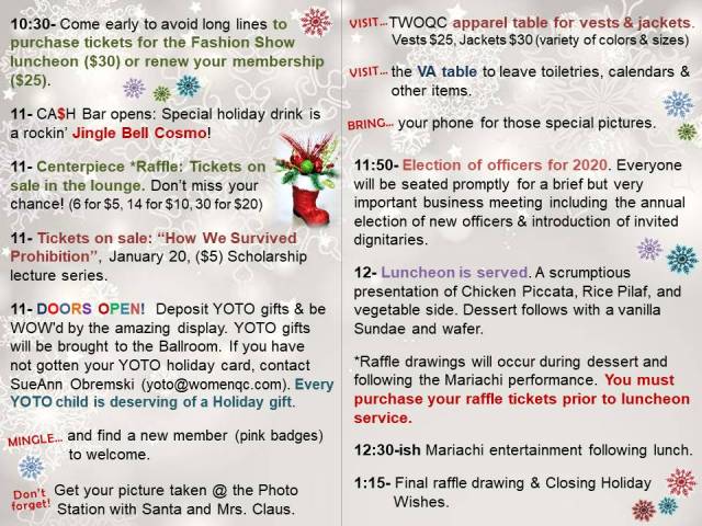 Come decked out in your most festive attire! Plan on photo opportunities with Santa and Mrs. Claus, compliments of club photographer, Eileen Sykora. Take a chance to win a gorgeous holiday centerpiece. Most of all, come to have holiday fun TWOQC style. Let’s make it the best yet Holiday gathering! (Click/tap schedule of events below to enlarge.)