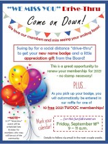 - Sept. 18 – 9-11AM Membership “We Miss You” Drive-Thru NEW