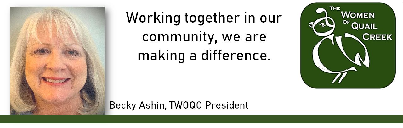 Our Membership Drive for renewals is over, but we welcome new members all year long. Every member of TWOQC is an ambassador for our organization. If you have a friend or new neighbor who does not belong, you have an opportunity to let them know of the wonderful charitable activities we do and our social events, like small-group gatherings.