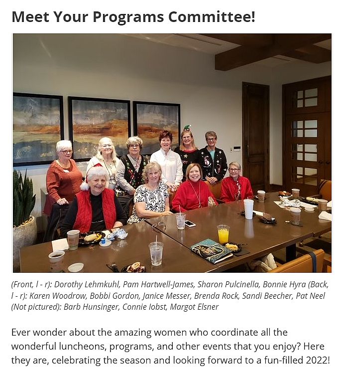 It is so wonderful that we are able to meet again in large group settings. The Javelina Hoedown, Roaring 20’s luncheon and Holiday luncheon were so successful and fun. Many more will be coming in 2022.