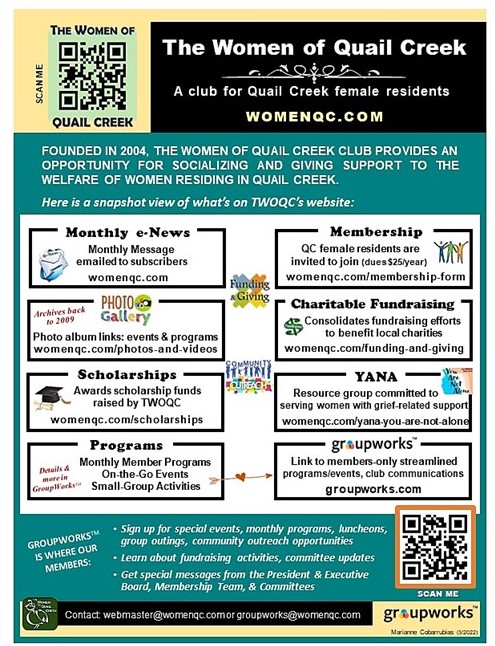 Members have full access to all programs and events. Female residents in Quail Creek are invited to join TWOQC! JOIN TODAY»
