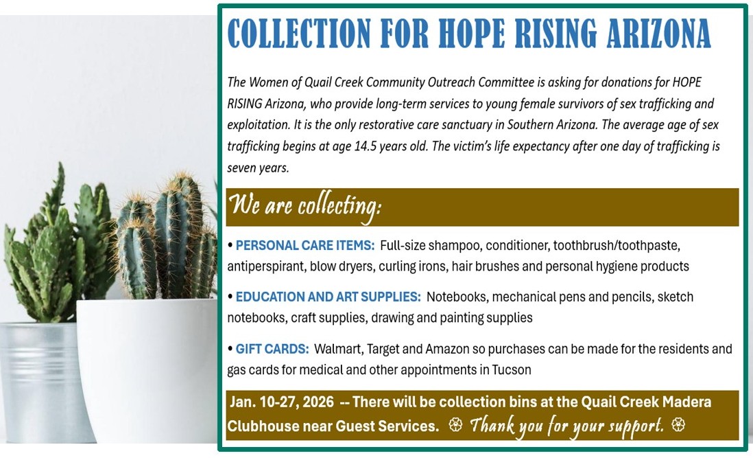 The Community Outreach Committee is accepting donations for HOPE RISING Arizona. Our efforts have been very successful with many of the items on their wish list being donated. These items include Personal Care items; Education and Art Supplies and Gift Cards to Walmart, Target, Speedway Gas, Amazon and Dining. We could definitely use additional Gift Cards. Our local community may leave donations at the Quail Creek Madera Clubhouse in donation bins through January 27.