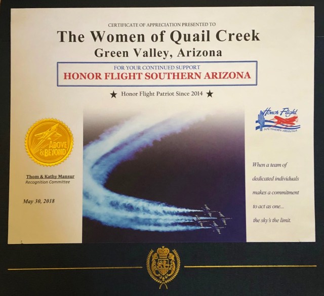 May 2017 — The “Family Readiness Appreciation Award” and plaque were presented at TWOQC’s May 22 program to The Women of Quail Creek from a representative of the 162d Wing Air National Guard.