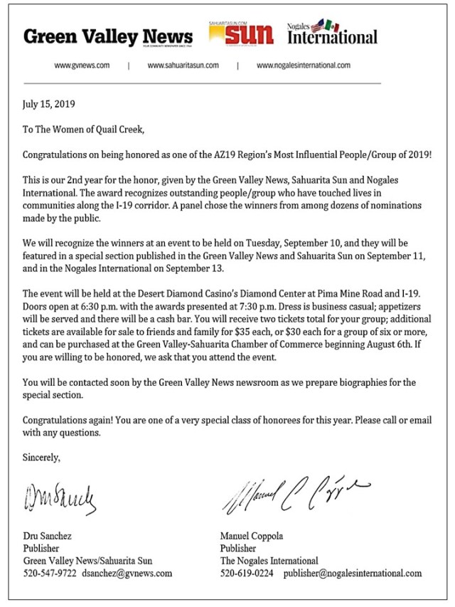 Influential People for 2019. Awardees were recognized as outstanding people/groups who have touched the lives of communities in the AZ 19 corridor and greater Santa Cruz County. Three hundred-plus honorees and guests gathered to celebrate the winners. On the organization’s behalf and amidst ovations and cheers, TWOQC received the award. Look for the award in the display case at the Creative Arts and Technology Center. We are proud to be recognized as making a difference in our community.