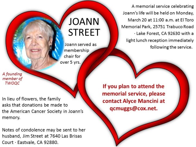 A Memorial Service celebrating Joann’s life was held on Monday March 20, 2017, at 11 a.m., at El Toro Memorial Park, 25751 Trabuco Road, Lake Forest, CA 92630, with a light lunch reception immediately following the service. In lieu of flowers, the family asks that donations be made to the American Cancer Society in Joann’s memory.
