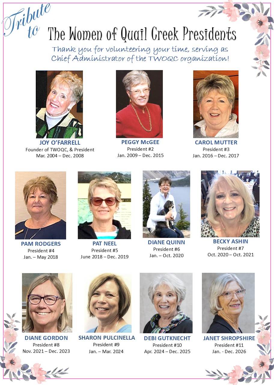 The Women of Quail Creek (TWOQC) was founded in March 2004. TWOQC presidents are the Chief Administrators of The Women of Quail Creek organization. Their duties include overseeing, and in some cases managing all of the organization’s operations. While the role is monumental, the members on this page have graciously stepped into the President’s position to provide and maintain continuity, integrity, and impeccable leadership. Thank you to the current and each past-president of TWOQC!